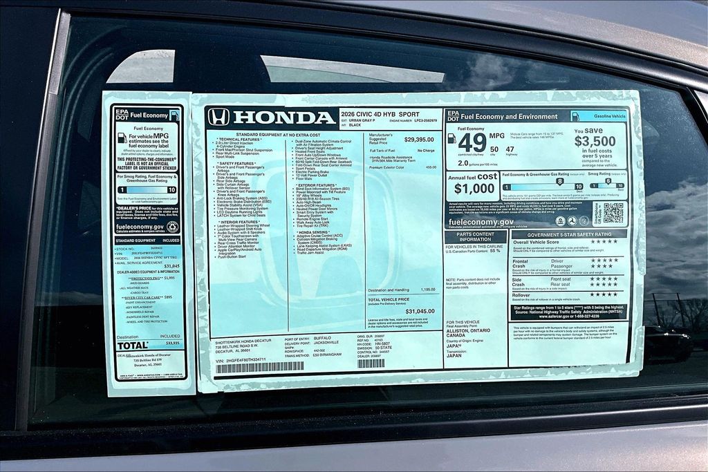Urban Gray Pearl 2026 Honda Civic Hybrid Sport FWD eCVT 2.0L 16V DOHC