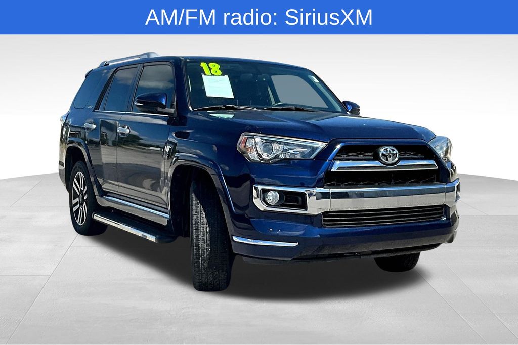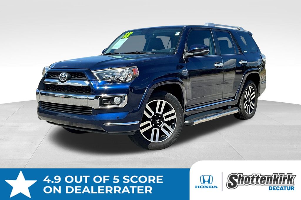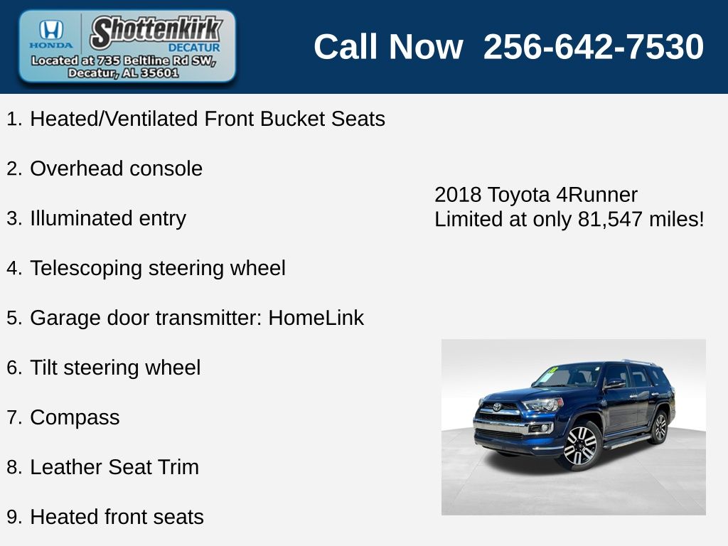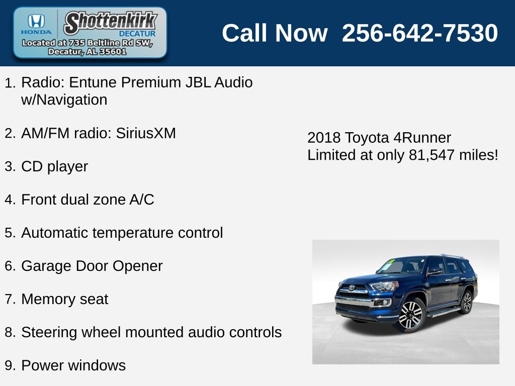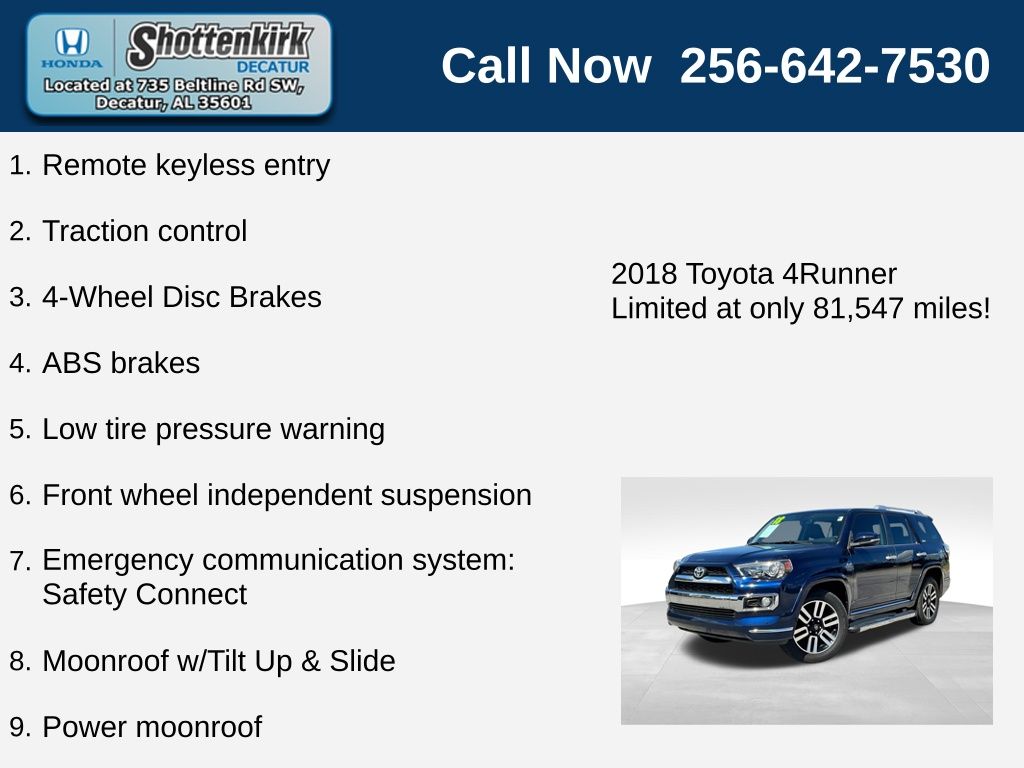CARFAX One-Owner. Clean CARFAX.RWD4Runner Limited, 4.0L V6 SMPI DOHC, 5-Speed Automatic with Overdrive, RWD, Blue, 20" x 7.5" Unique Dual 6-Spoke Alloy Wheels, 4-Wheel Disc Brakes, ABS brakes, Alloy wheels, AM/FM radio: SiriusXM, Auto-Dimming Rear-View Mirror, Automatic temperature control, Body Color Heated Mirrors, CD player, Compass, Electronic Stability Control, Emergency communication system: Safety Connect, Exterior Parking Camera Rear, Front dual zone A/C, Front fog lights, Front wheel independent suspension, Garage Door Opener, Garage door transmitter: HomeLink, Heated door mirrors, Heated front seats, Heated/Ventilated Front Bucket Seats, Illuminated entry, Leather Seat Trim, Low tire pressure warning, Memory seat, Moonroof w/Tilt Up & Slide, Overhead console, Power door mirrors, Power moonroof, Power passenger seat, Power windows, Radio: Entune Premium JBL Audio w/Navigation, Rear window wiper, Remote keyless entry, Spoiler, Steering wheel mounted audio controls, Telescoping steering wheel, Tilt steering wheel, Traction control, Turn signal indicator mirrors, Ventilated front seats.2018 Toyota 4Runner Blue 4.0L V6 SMPI DOHC 5-Speed Automatic with Overdrive 4D Sport Utility LimitedThank you for making your way to Shottenkirk Honda Decatur, your certified Honda dealer serving drivers throughout Decatur, Huntsville, Madison, Athens, Priceville, Hartselle, Danville, Cullman, Vinemont, Moulton, Trinity, Florence, Muscle Shoals, Harvest, Somerville, Arab, New Hope, Gurley, Eva, Guntersville, Scottsboro, Gadsden, Boaz, Owens Cross Roads, Hazel Green, Elkmont, Meridianville, and the surrounding areas. At our dealership, you’ll find a great selection of new Hondas for sale, as well as a carefully inspected lineup of pre-owned vehicles. We also have a well-connected finance center run by a qualified team of finance experts, who can help you get the right loan or lease in a quick, easy, and transparent manner.Awards: * 2018 KBB.com Best Resale Value Awards * 2018 KBB.com 10 Most Awarded Brands
