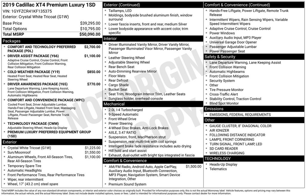 XT4 Premium Luxury, 2.0L I4 Turbocharged, 9-Speed Automatic, FWD, Crystal White Tricoat, Black Leather, 2-Way Driver Seat Power Lumbar Control, 2-Way Passenger Seat Power Lumbar Control, 4-Way Driver Seat Power Lumbar Control, 4-Way Passenger Seat Power Lumbar Control, 4.2" Diagonal Color Display Driver Info Center, 6-Way Power Passenger Seat Adjuster, 8-Way Power Driver Seat Adjuster, 8-Way Power Passenger Seat Adjuster, 8" Diagonal Color Display Driver Info Center, Advanced Adaptive Cruise Control, Air Ionizer, AM/FM radio: SiriusXM, Apple CarPlay/Android Auto, Auto-dimming door mirrors, Auto-Dimming Inside Rear-View Mirror, Automatic temperature control, Body-Color Heated Power-Adjustable Outside Mirrors, Bose Centerpoint Surround Sound 13-Speaker System, Cold Weather Package, Comfort & Convenience Package, Comfort & Technology Preferred Package, Driver Assist Package, Driver Awareness Package, Driver Seat Massage Control, Dual Panel Glass Sunroof w/Power Tilt/Sliding, Electronic Cruise Control w/Set & Resume Speed, Emergency communication system: OnStar and Cadillac connected services capable, Exterior Parking Camera Rear, Following Distance Indicator, Forward & Reverse Automatic Braking, Forward Collision Alert, Front & Rear Park Assist, Front Cornering Lamps, Front dual zone A/C, Front Passenger Seat Massage Control, Front Pedestrian Braking, Garage door transmitter, Hands-Free Liftgate, HD Rear Vision Camera, Heated Automatic Steering Wheel, Heated door mirrors, Heated Driver & Front Passenger Seats, Heated Rear Outboard Seating Positions, IntelliBeam Automatic High Beam Control, Lane Keep Assist w/Lane Departure Warning, Leather Seating Surfaces, Leather steering wheel, LED Front Lamp Turn Signal, Low Speed Forward Automatic Braking, Manual Rake & Telescopic Steering Column, Memory seat, Outside temperature display, Power door mirrors, Power Rake & Telescopic Steering Column, Power Rear Liftgate, Preferred Equipment Group 1SD, Radio: Cadillac User Experience w/Embedded Nav, Rain sensing wipers, Reconfigurable Full-Color Head-Up Display, Remote keyless entry, SD Card Reader, SiriusXM Radio, Technology Package, Telescoping steering wheel, Ventilated Driver & Front Passenger Seats, Wheels: 18" 10-Spoke Pearl Nickel Finish Alloy, Wireless Charging.